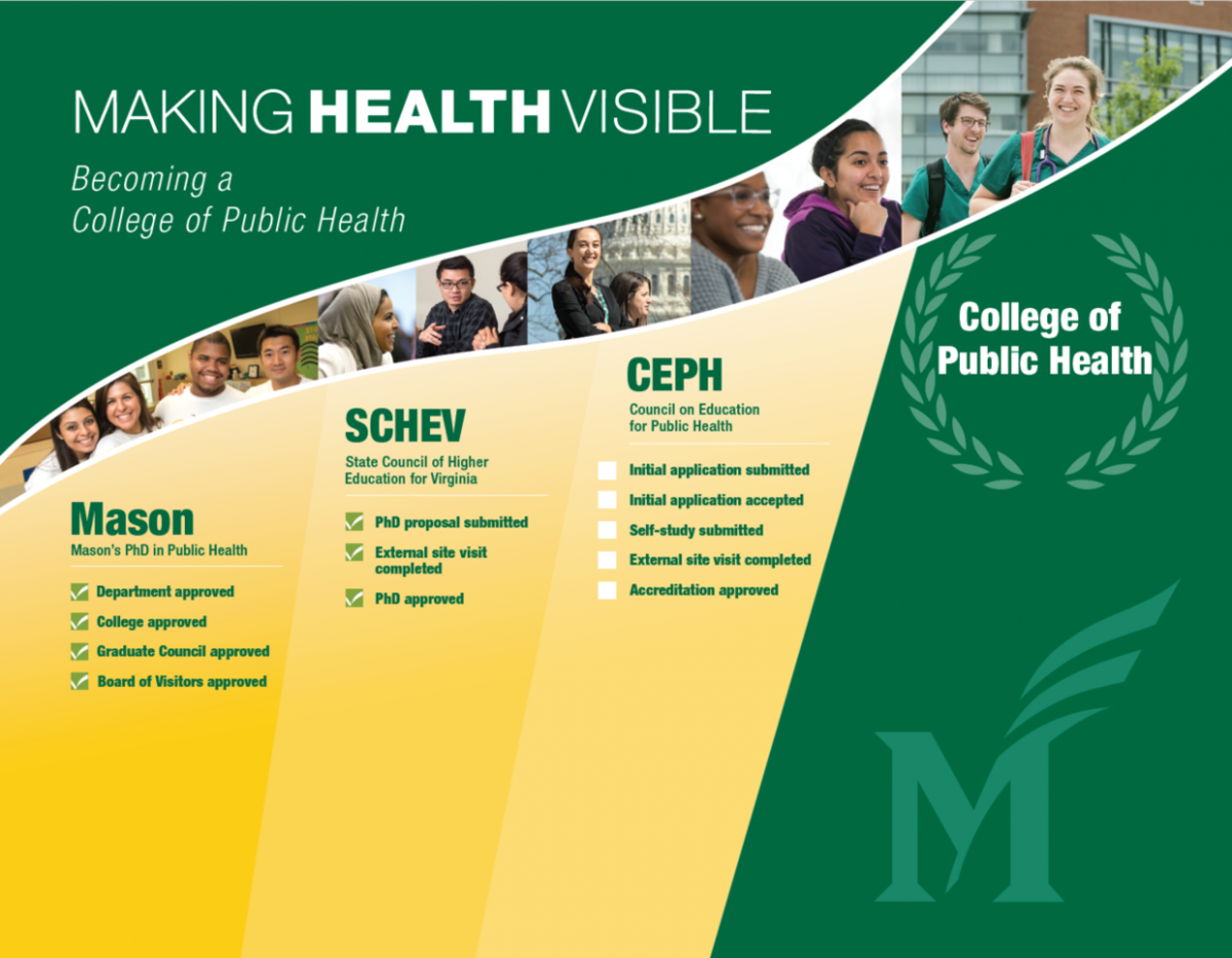 Following a successful external site review held on June 17, 2020, SCHEV granted approval for the new PhD in Public Health degree, a program that will prepare career-ready graduates for academic and research careers in public health. The external reviewers praised the new degree program, particularly the quality of the College’s faculty and their commitment to research mentoring; the curriculum’s interdisciplinary focus on the social determinants of health; and the hands-on approach for ensuring student success. The reviewers also noted the existing infrastructure and resources to support the degree program at Mason and within the College, including the Peterson Family Health Sciences Hall and the Population Health Center.