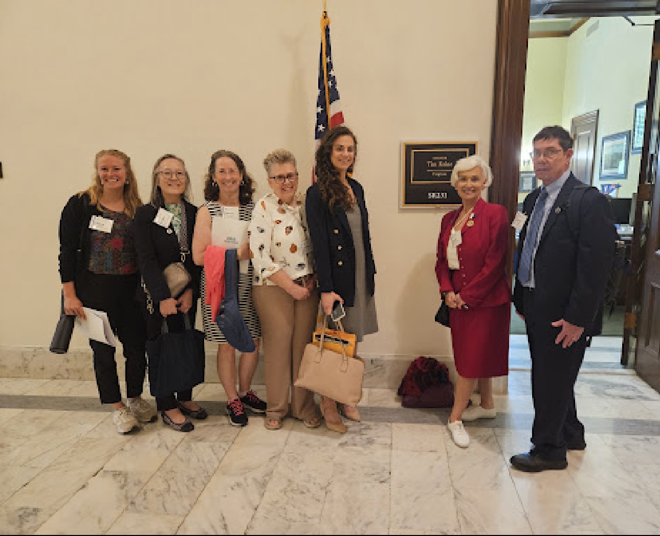 As part of the Virginia delegation, Chen and Bennett met with legislative staff from the offices of Senators Mark Warner and Tim Kaine, Congressmen H. Morgan Griffith and Don Beyer, and Congresswoman Erica Eisenman. They advocated for sustained investment in programs that support older adults, including Medicaid, the Administration for Community Living programs such as Meals on Wheels, and funding for the National Institutes of Health (NIH). They emphasized the economic and scientific value of NIH support—highlighting that in fiscal year 2023, NIH funding generated an estimated $92.9 billion in economic activity, with every $1 of investment returning $2.50 in economic benefits. Using data from Science Impacts, Chen and Bennett illustrated the potential impact of proposed budget cuts on research progress and job losses.